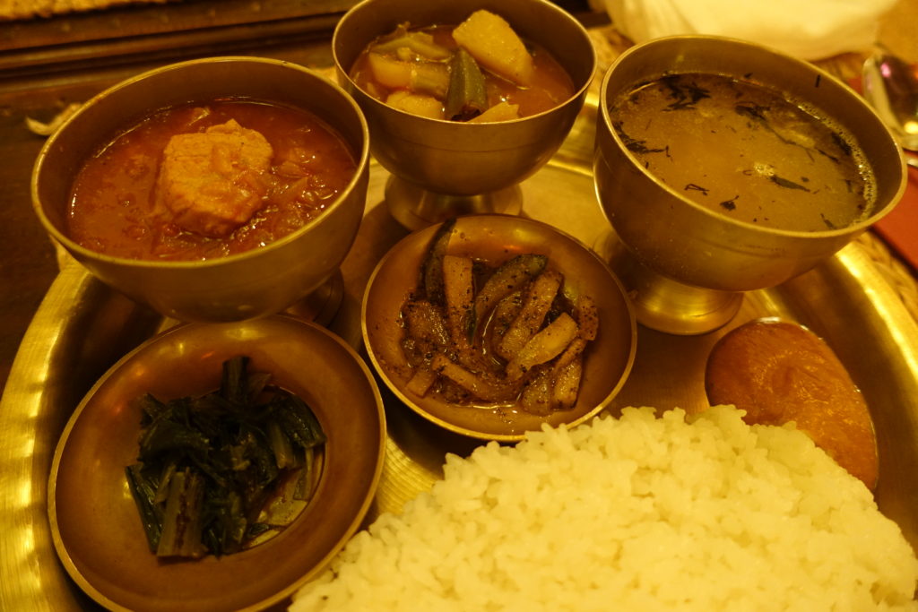ダルバートを調べるとネパールの定食のようなもので、ワンプレートでダール(豆のスープ)とバート(ごはん)とカレー味の野菜、アツァール(漬物)がセットになったものを言うらしい。