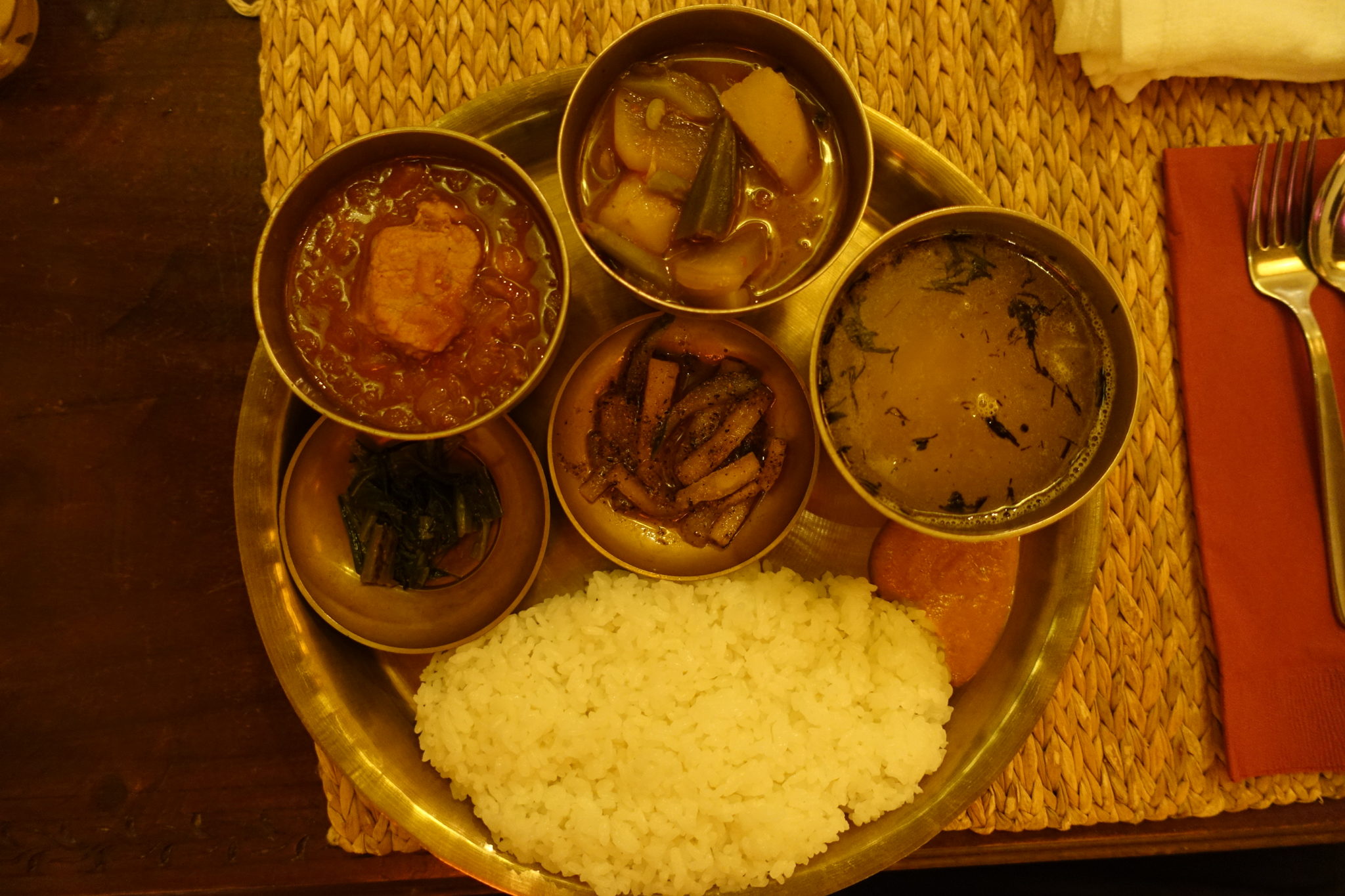 ダルバートを調べるとネパールの定食のようなもので、ワンプレートでダール(豆のスープ)とバート(ごはん)とカレー味の野菜、アツァール(漬物)がセットになったものを言うらしい。