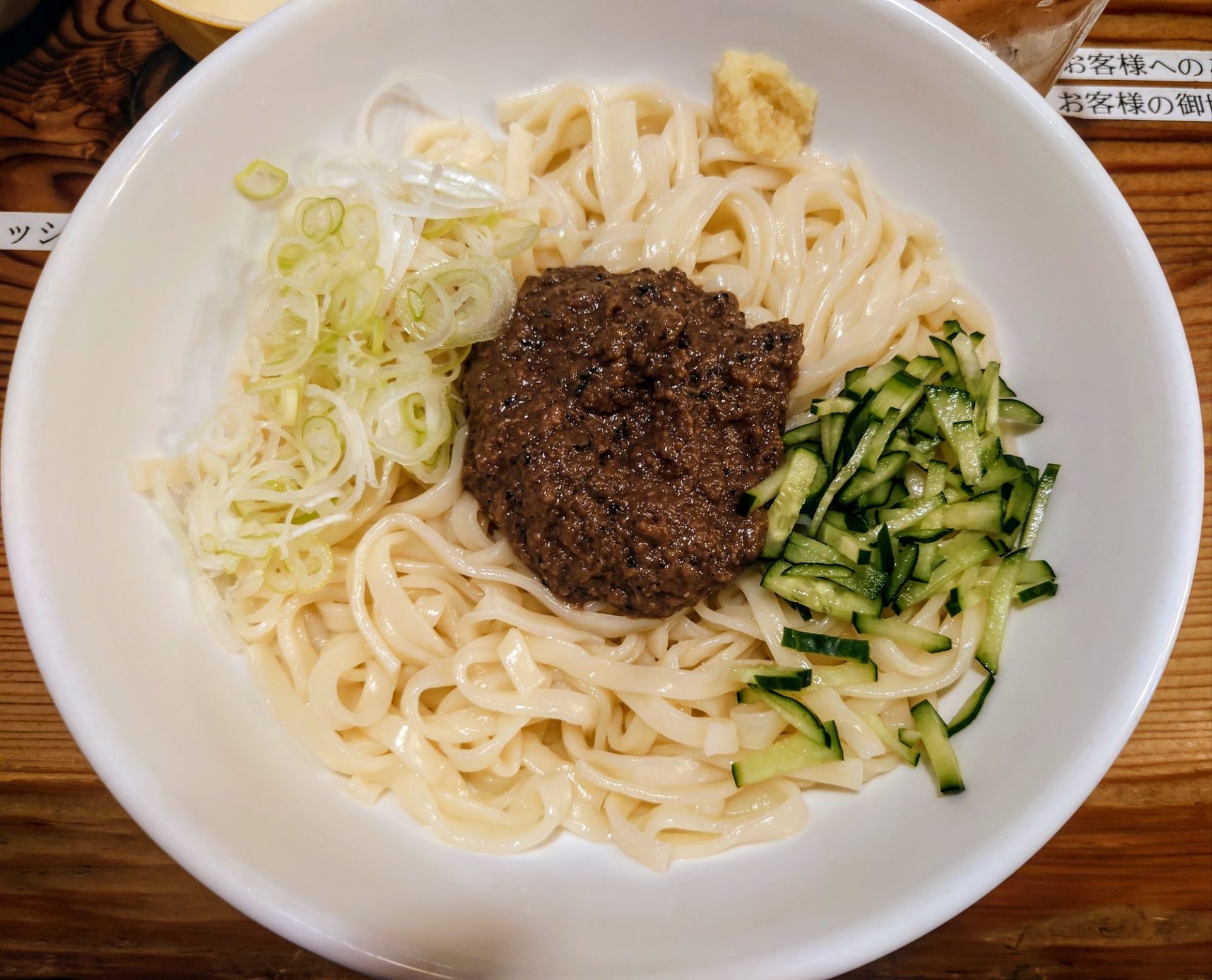 うどんに肉みそと薬味が乗っているだけ、と一見シンプルな見た目。