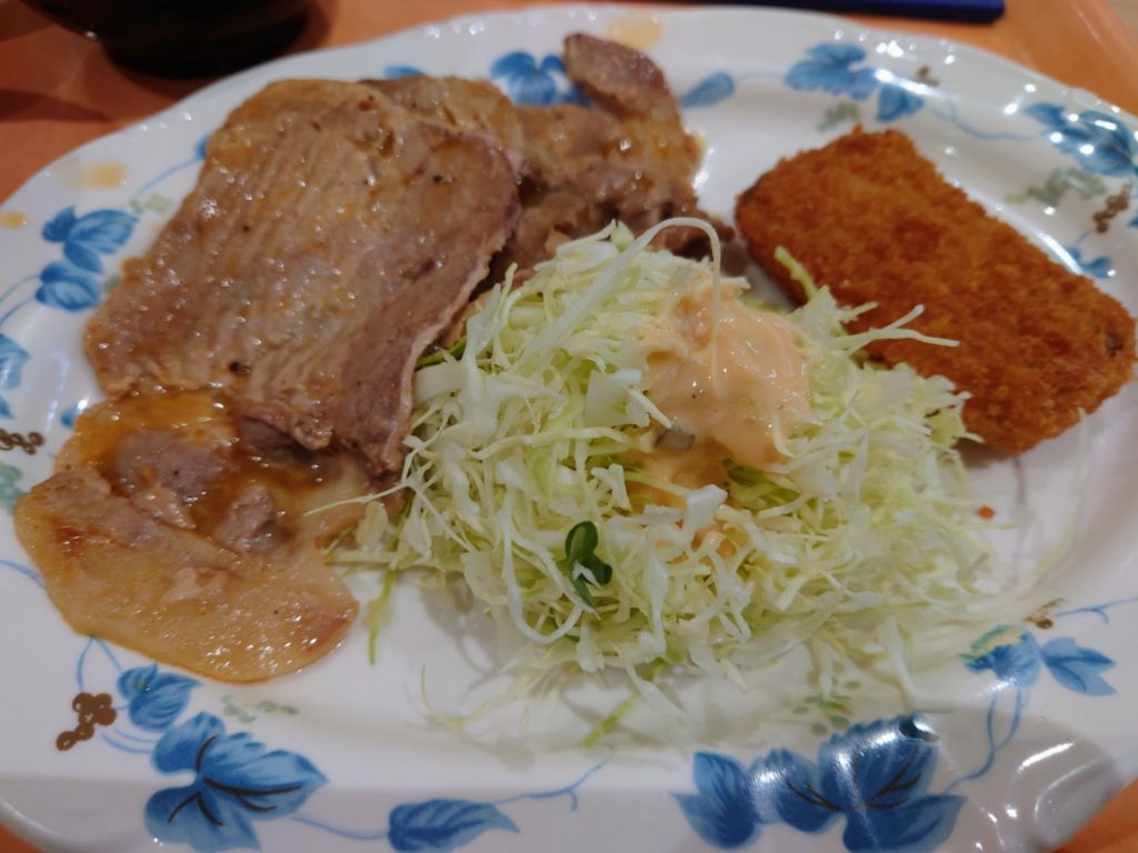 今日の定食は豚肉の山賊焼き、気仙沼産かつおカツ付きでした