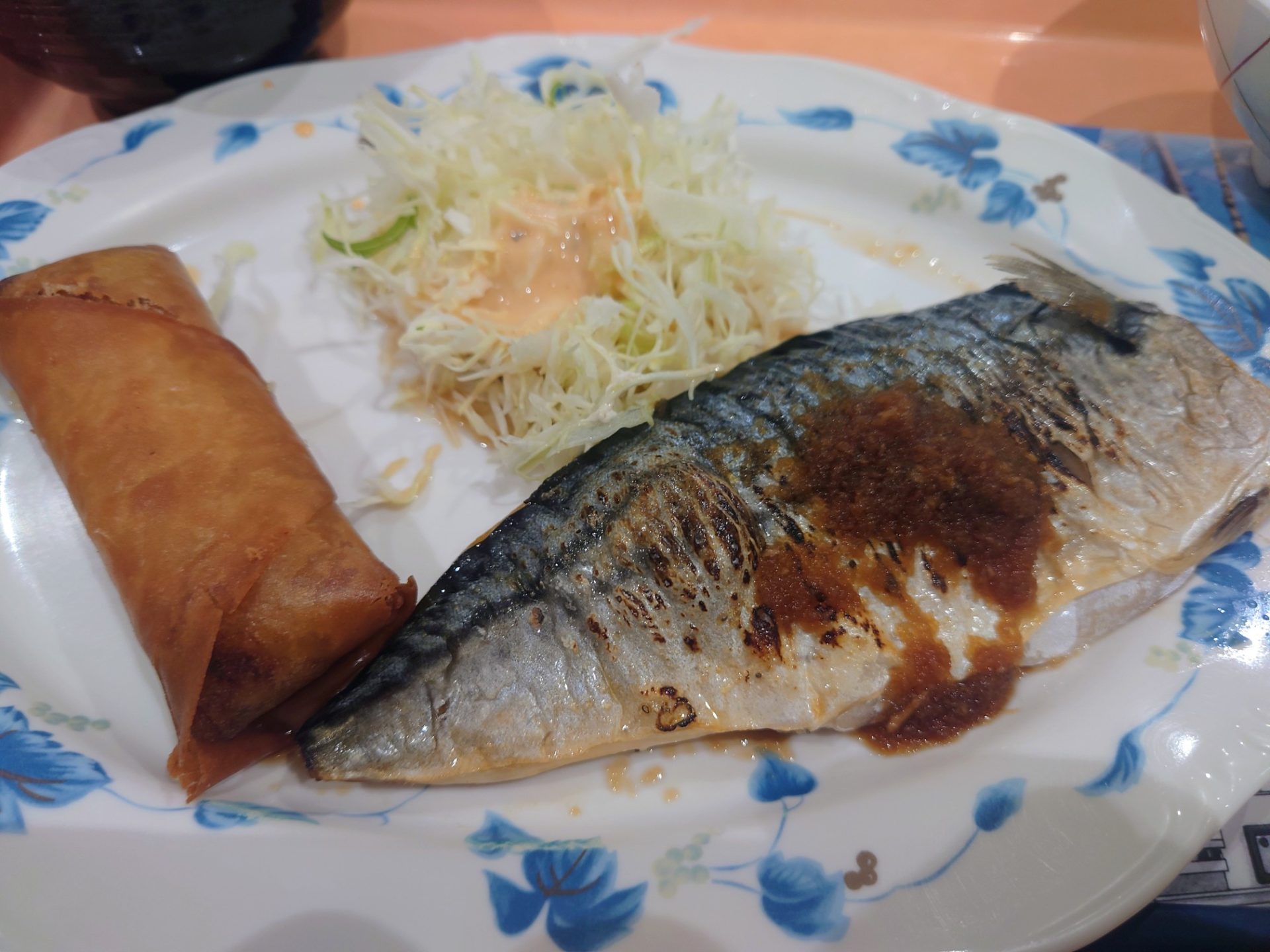 お昼は鯖のガーリックソースがけと春巻き