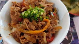今日はステーキ豚丼でしたステーキ?って感じの薄切り肉だったけど、ガーリックソースとよく合って美味しかった!